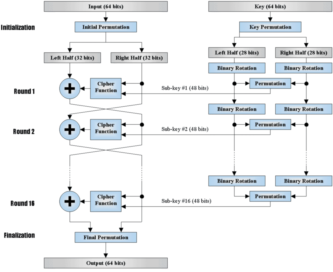 对于密钥: 1. 取 56 位进行密钥置换 (Key Permutation) 后分为左右两部分 (L, R) 2. 每一轮加密过程中: - 经过 Binary Rotation 和 Permutation 后得到 48 bits 的 sub-key 传给主要加密部分使用