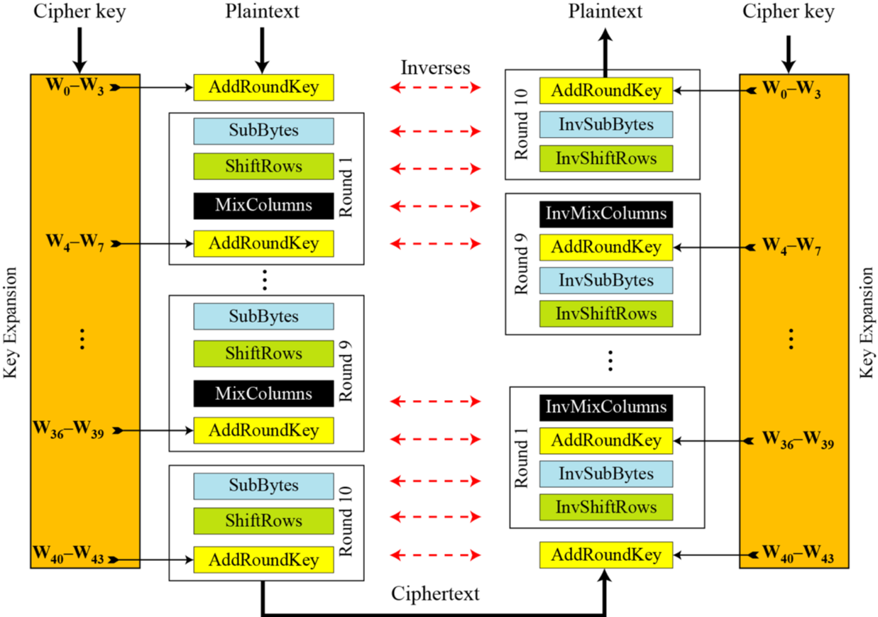 解密时也不过是每个盒子的逆操作,然后顺序也是反向的。更加详细的加密过程如下: