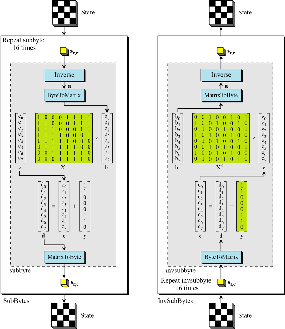 字节替换阶段有对应的数学规则定义替换表,如图(运算定义在 \(GF(2^8)\) 中