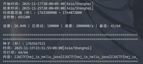 简单逆向查看可以得知,程序将 flag (循环扩展到 64 位)与一个比赛期间的某秒初始化的随机数生成器生成的随机数进行异或得到密文;因此,只需要爆破这个时间戳、检查可打印字符情况: