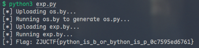 为此我们可以上传一个伪造的 os.by 文件在伪造的 os 模块中,让 access() 函数永远返回 False;当 sandbox.by 执行 os.access("/flag", os.R_OK) 时,会导入我们的假 os 模块返回 False 导致 secure() 不被调用,沙箱失效。