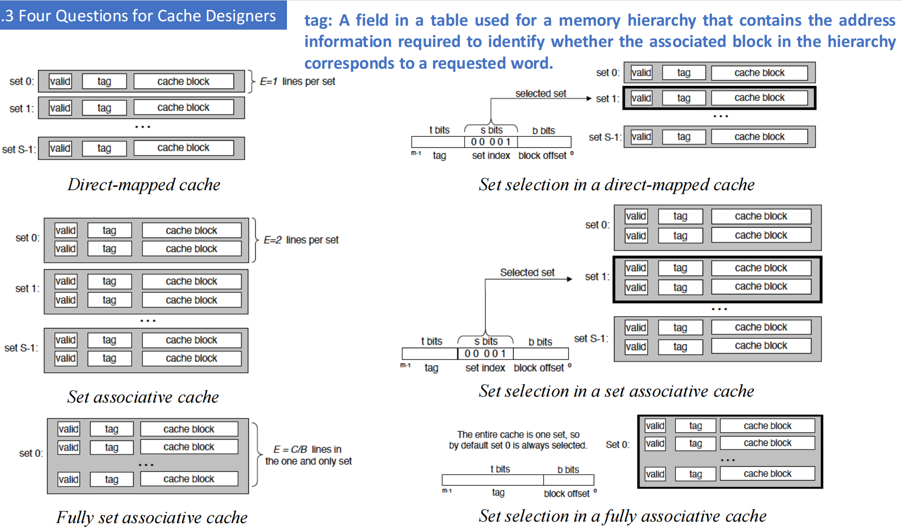 - 当发生缓存未命中时,并不仅仅是请求的那个字 (word) 被调入缓存,而是包含该字的整个数据块会从主存复制到缓存中的一个块 / 行。