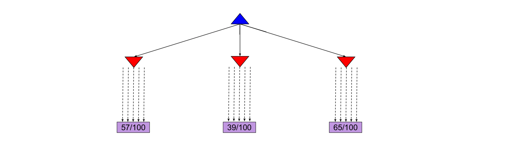 From the current state we have three different available actions (left, middle and right). We take each action 100 times and we record the percentage of wins for each one.